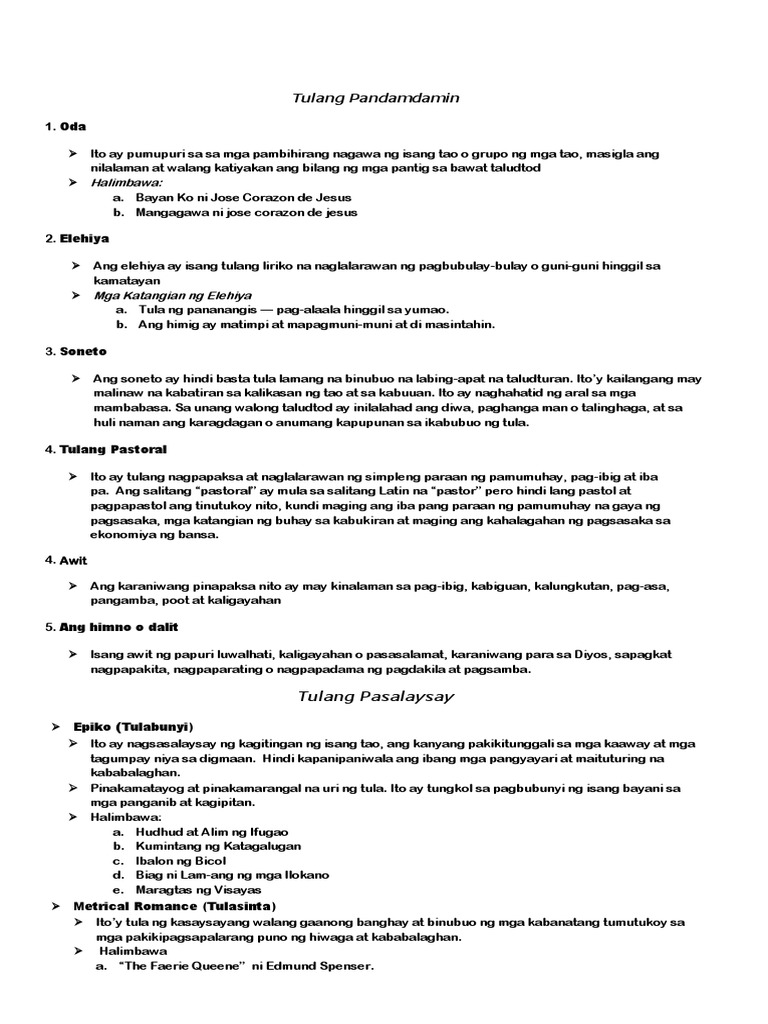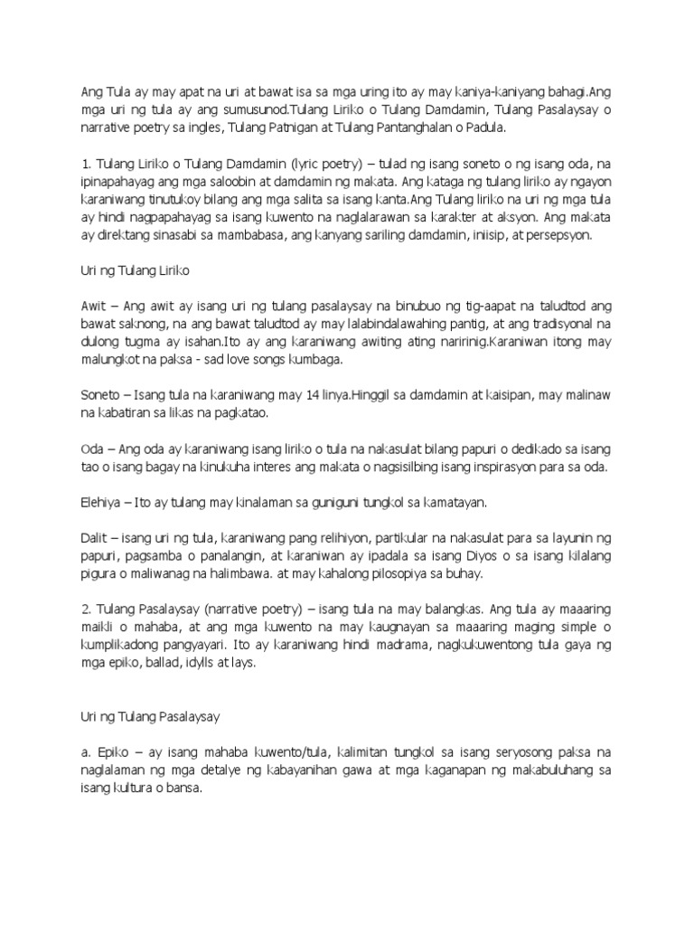 Ang tulang ito ay naglalarawan ng mahahalagang mga tagpo o pangyayari sa buhay. Karaniwang tinatalakay nito ang mga diyos-dyosan o bathala at nagbibigay ng paliwanag tungkol sa likas na kaganapan. Tula Akdang pampanitikang naglalarawan ng buhay hinango sa guniguni pinararating sa ating damdamin at ipinahahayag sa pananalitang may angking aliw-iw Nangangailangan ng masusing pagpili ng mga salita pagbilang ng mga pantig at paggamit ng magkakatugmang salita upang madama ang isang damdamin o kaisipang nais ipahayag ng isang.