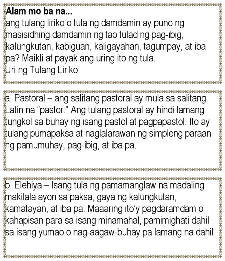 Ito ay isang uri ng panitikan na nag bibigay diin sa ritmo at nag papahayag ng damdamin. Soneto- tulang may labing apat na talud-tud hinggil sa. Ang elehiya ay isang uri ng Tulang Liriko na pumapaksa sa damdamin katulad ng kalungkutan kasawian o kaligayahan Binibigyang-parangal dito ang mga nagawa ng yumao 4.