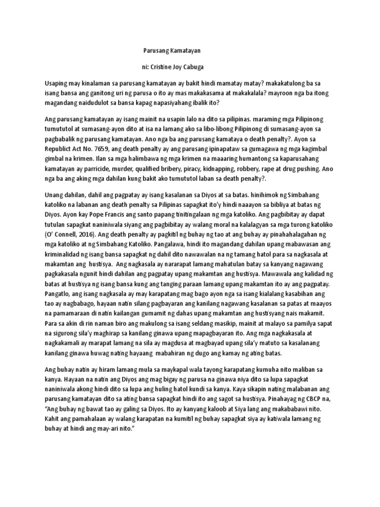 Ng parusang kamatayan pero hindi kayang bumayad ng pagkatawang pambatas. 1432017 Ang parusang kamatayan ay isa lang sa isyung panlipunan na humahati sa paniniwala ng mga tao. INTRODUKSYONKilala ang Pilipinas bilang isang Katolikong bansa bansang nakasentro sa paniniwala sa Diyos at pagsunod s autos nito.