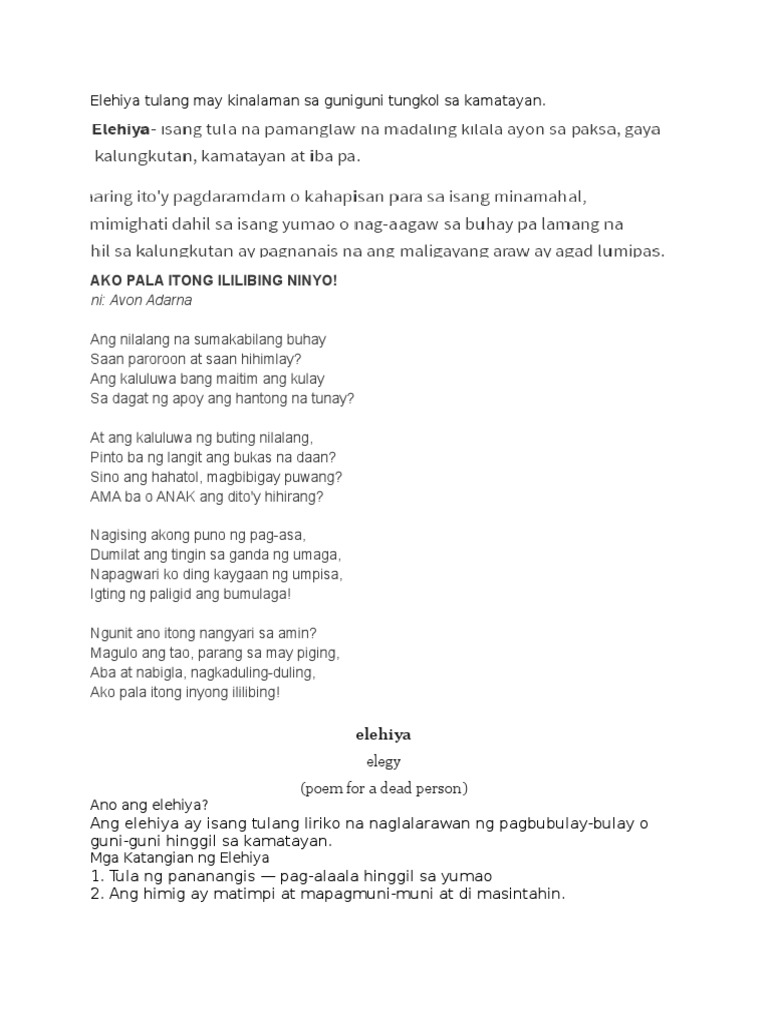 Ang tula ay isang Elehiya na tulang may kinalaman sa guniguni tungkol sa kamatayan. Report an issue. Ito ay isag kuwento tugkol sa pagsasakripisyo ng nakatatandang kapatid upang alagaan ang kanyang mga kapatid.