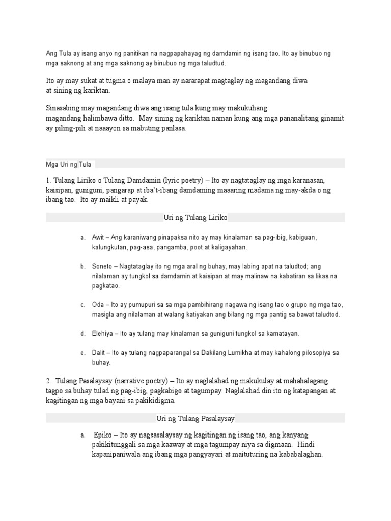 Bulong- ginagamit bilang pagbibigay-galang o pagpapasintabi sa mga. SONETO isang tula na karaniwang may labing apat na linya ito ay may mga aral sa buhay. Ito ay tulang may kinalaman sa guniguni tungkol sa kamatayan.