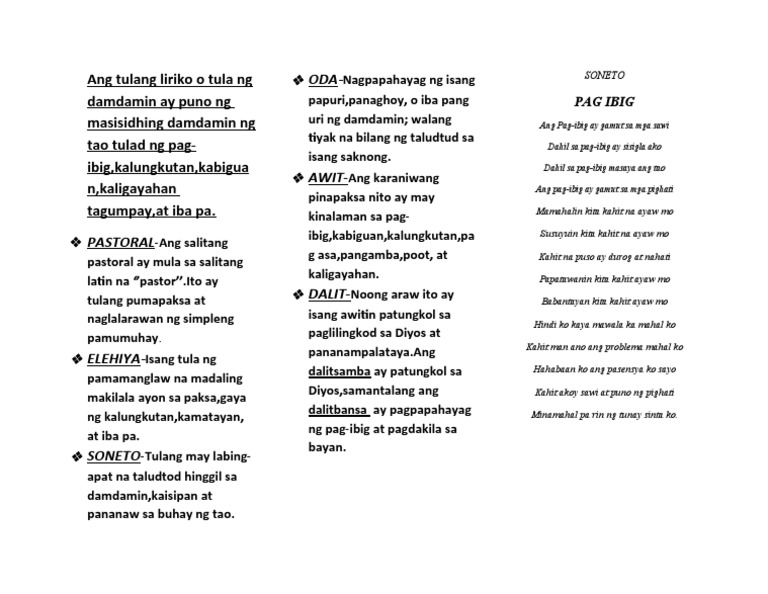 Soneto Tulang may labing-apat na taludtod 14 at ang bawat taludturansaknong ay may dalawang taludtodKaraniwang pumapaksa sa damdamin at kaisipan at nakikilala sa matinding kaisahan at kasiksikan ng nilalaman.