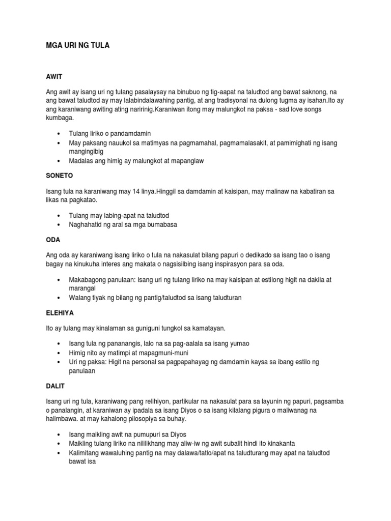 Tulang pumapaksa sa kamatayan. Anong tawag sa mga tulang pumapaksa sa mga damdamin. Epiko awit at kurido karaniwang tulang pasalaysay. Karaniwang para ito sa mga diyos o pinaniniwalaang panginoon upang magpakita ng pagsamba.