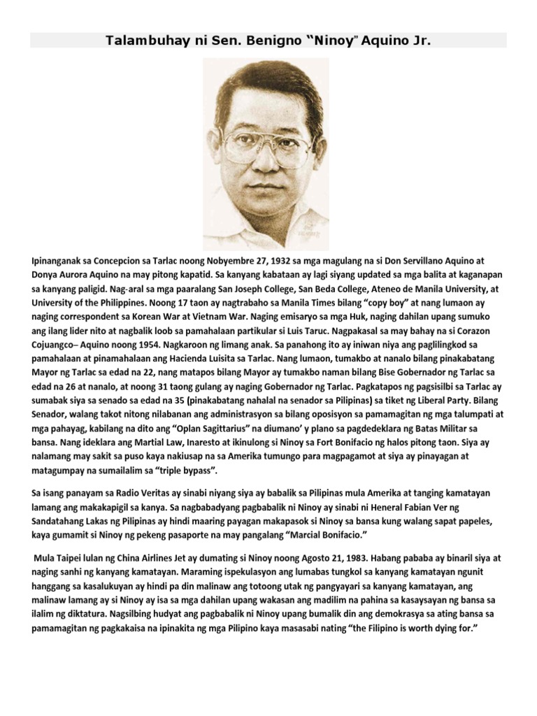 November 27 1932 August 21 1983 was a Filipino politician who served as a Senator of the Philippines 19671972 and governor of the province of Tarlac. He was the husband of Corazon Aquinowho after his death eventually became President of the Philippinesand father. A Mass Requiem in Manila.