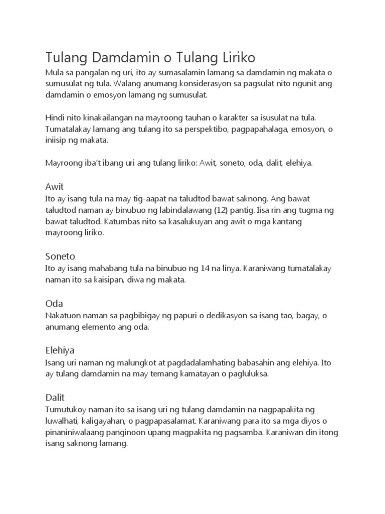 2872017 Tulang Liriko o Pandamdamin -nagtataglay ito ng mga karanasangunigunikaisipan at mga pangarap tungkol sa pag-ibigligayalungkothinanakit atbpKaraniwan itong maikli at payak at itinatampok dito ng makata ang kanyang sariling damdamin. Itoy may layuning maglarawan ng tunay na buhay sa bukid. Dalit Ito ay mga awit na pumupuri sa Diyos o sa Mahal na Birhen.