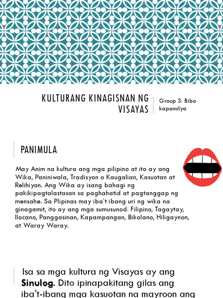 KULTURANG KINAGISNAN NG Group 3. Ang Anito Ang ating mga ninuno ay naniniwala sa kabilang buhay at mga espiritu ng kanilang mga namatay-naniniwala din sila na kasama nila ito araw-araw. VISAYAS kapamilya PANIMULA May Anim na kultura ang mga pilipino at ito ay ang Wika Paniniwala Tradisyon o Kaugalian Kasuotan at Relihiyon.