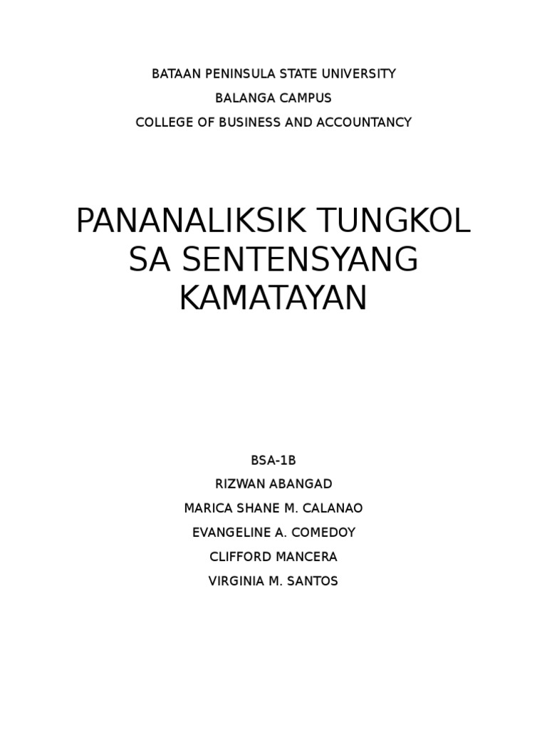 Depinisyon ng mga TerminolohiyaDeath Penalty -Parusang kamatayan binibigay ito sa mga taong nasangkot sa mga krimen na itunuturing ng isang bansa na kumukondena sa seguridad nitoABM Accountancy Business and Management Strand -ang strand na ito ay sumasaklaw sa mga senior highschool na gustong kumuha ng mga kursong pinansyal Business Management at mga pang-korporasyon na kurso sa. Ang Parusang Kamatayan. Kabanata I ANG SULIRANIN Itong pagpapanaliksik ay nauukol mga pananaw ng mga mamamayan tungkol sa pagpapatupad ng parusang kamatayan.
